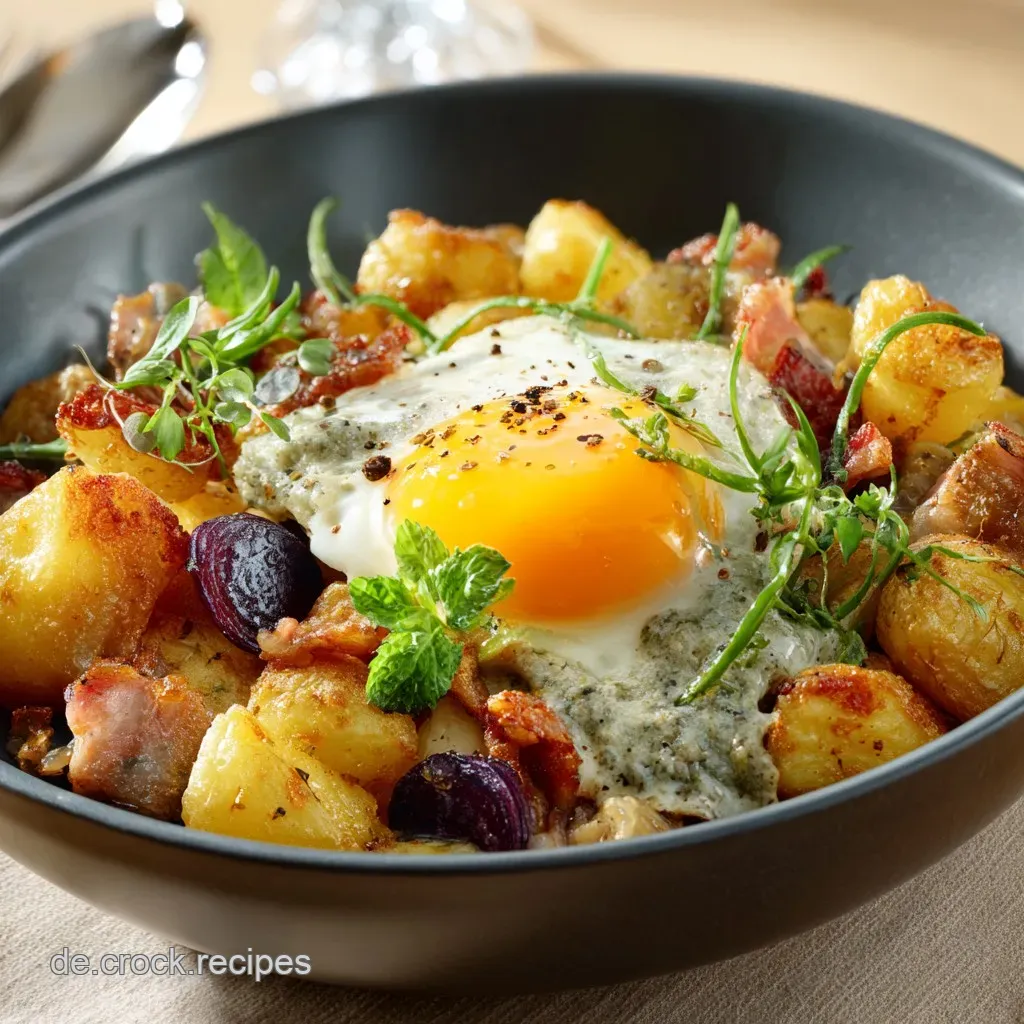 Das Wesentliche ist die herzhafte Basis aus knusprigen Kartoffeln, Zwiebeln, geräuchertem Fleisch und den Eiern; typisch deutsch wird es mit scharfen Gewürzgurken (Spreewälder Art) und einem frischen, einfachen Blattsalat serviert, um einen säuerlichen Kontrast zur Deftigkeit zu schaffen.
