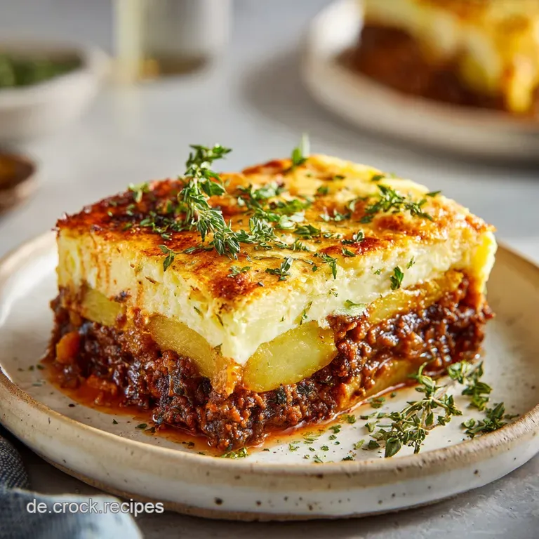 Beginne mit einer stabilen Basis aus vorgedünsteten Kartoffelscheiben, gefolgt von der Fleischsauce, dann die gerösteten Auberginen und abschließend die Béchamelsauce. Röste die Auberginen im Ofen statt sie zu braten, um Ölaufnahme zu minimieren.