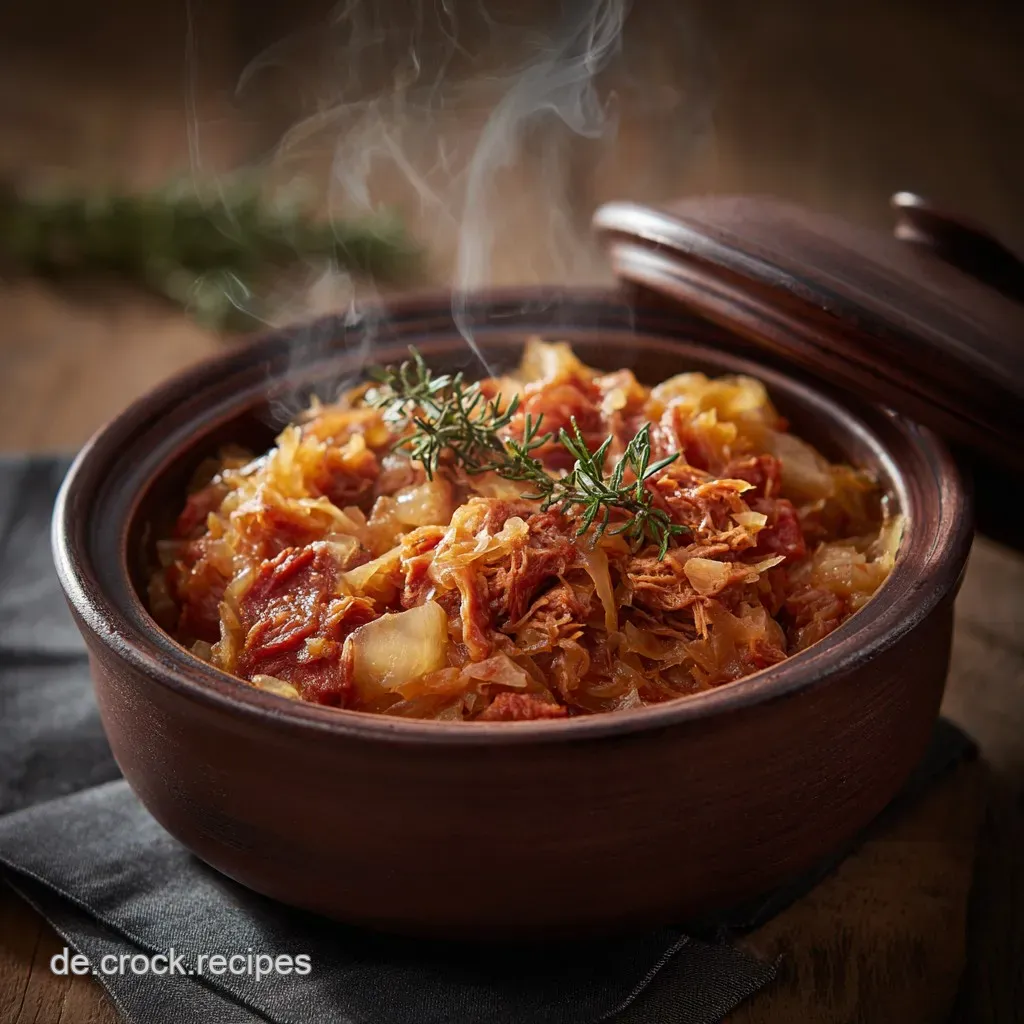 Bevor Sie servieren, fischen Sie die Lorbeerblätter und Pimentkörner heraus. Schmecken Sie den Eintopf sorgfältig ab. Falls die Säure des Krauts zu dominant ist, kann ein halber Teelöffel Zucker helfen, die Balance wiederherzustellen.