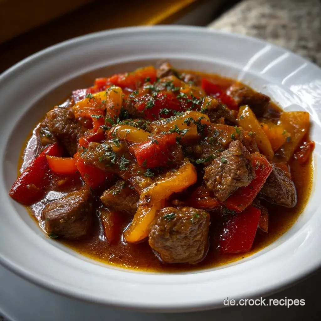 - Ablöschen und Köcheln: Lösche sofort mit der Brühe und den Dosentomaten ab. Rühre alles gut durch, kratze die angebrannten Reste vom Boden (das ist purer Geschmack!) und füge die Lorbeerblätter hinzu. Gib das Fleisch zurück. Lass die Soße 15 Minuten leise vor sich hin blubbern, damit sich die Aromen vermählen können.