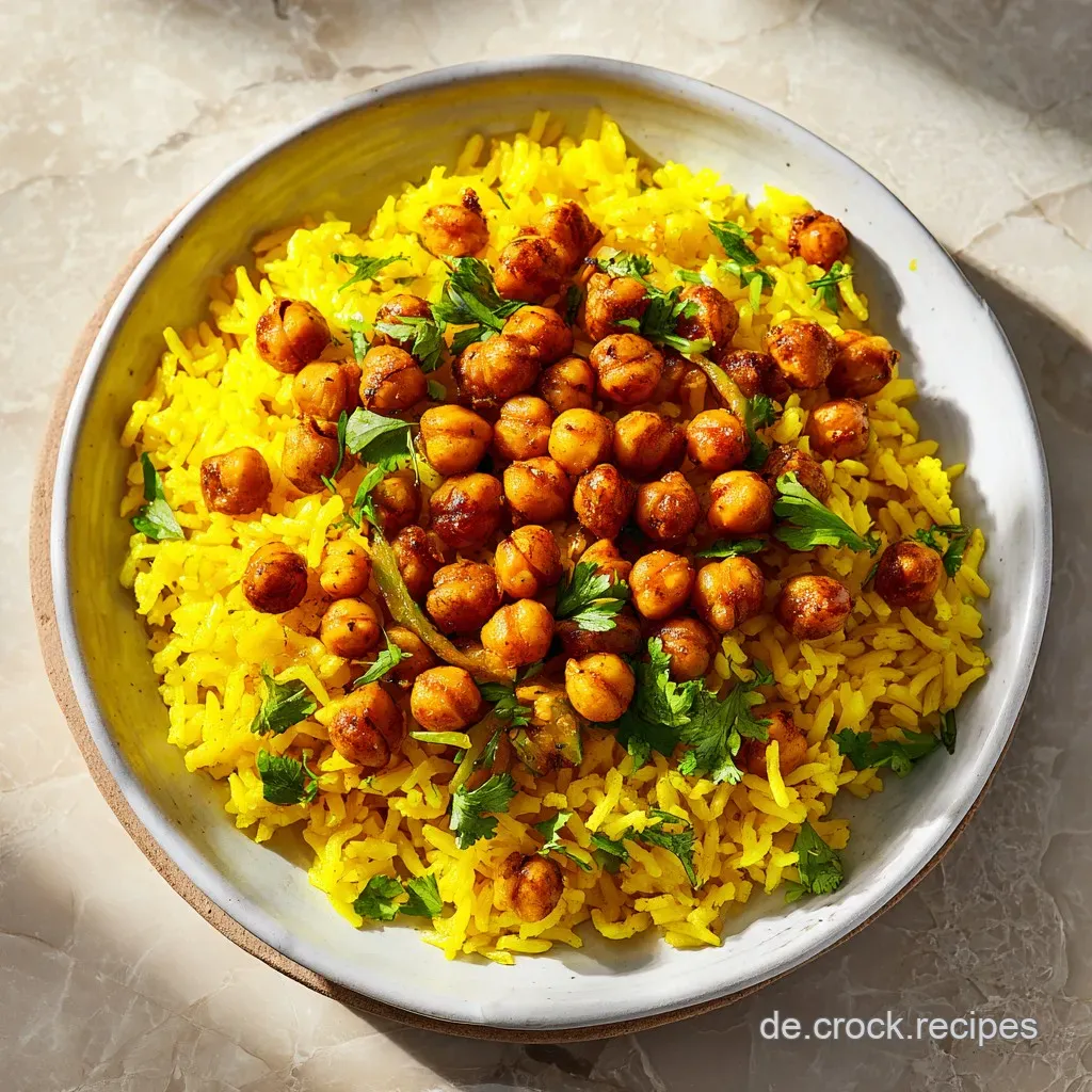 - Flavor/Texture Hook: Knusprig geröstete Kichererbsen treffen auf lockeren Kurkuma Reis