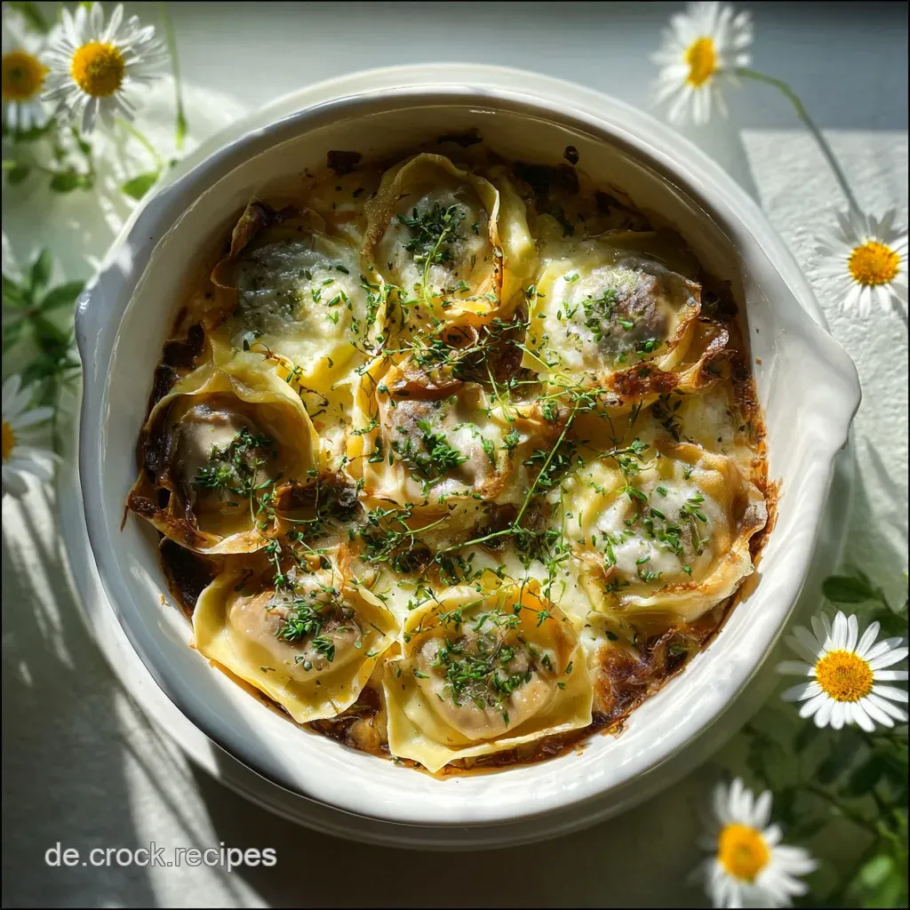 Eine breite Auflaufform aus Keramik sorgt für eine gleichmäßige Wärmeverteilung während des Gratinierens, sodass die Sauce am Rand leicht einkocht, während die Maultaschen im Kern saftig bleiben.