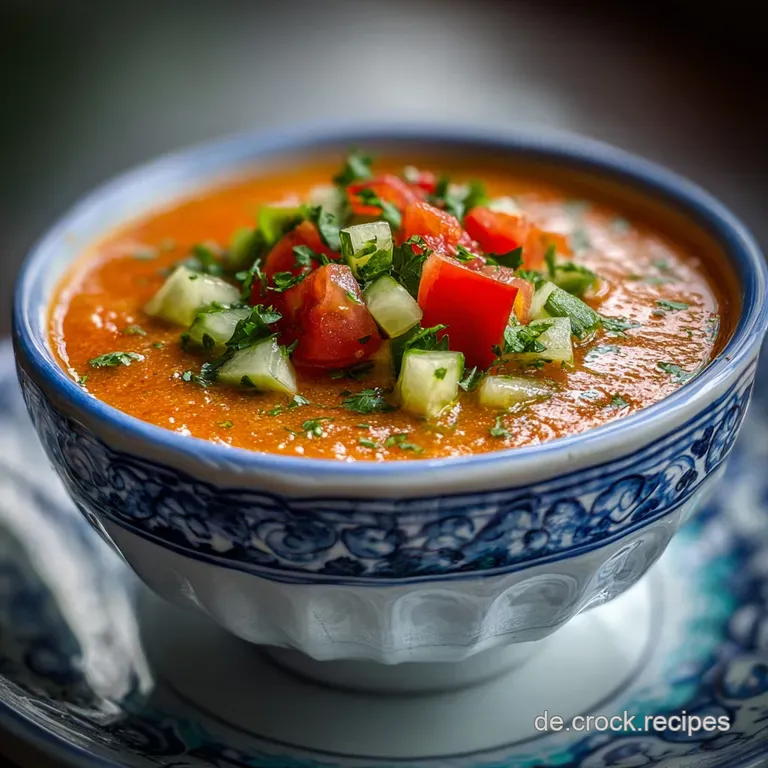 Eine kalte Gemüsesuppe. Gazpacho ist eine traditionelle, kalte Gemüsesuppe aus Andalusien, die hauptsächlich aus rohen, pürierten Zutaten wie Tomaten, Gurken und Paprika besteht. Sie ist die perfekte Erfrischung für heiße Sommertage.