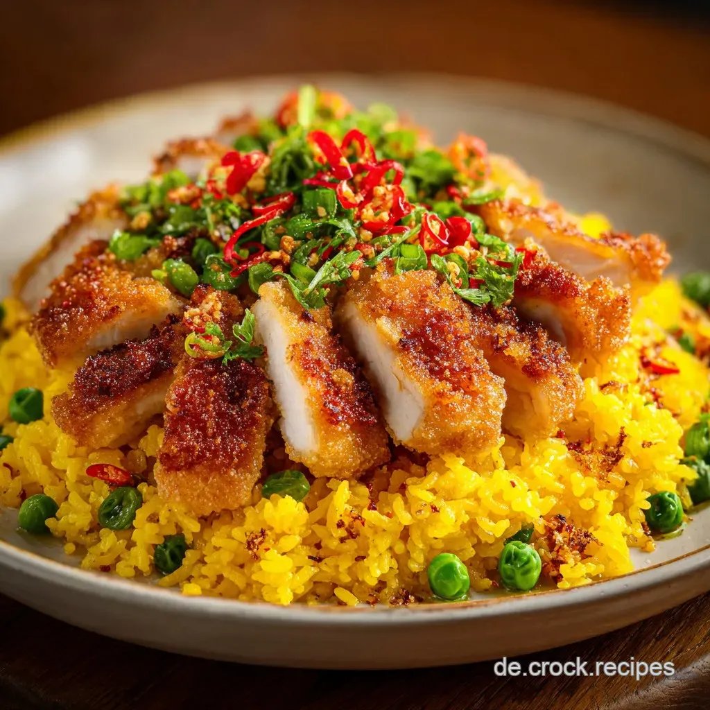 - Flavor/Texture Hook: Goldgelber, lockerer Reis trifft auf knuspriges Hähnchen