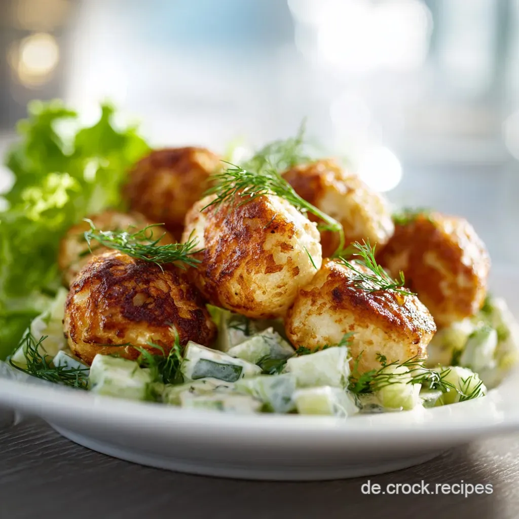 Serviere die heißen Bällchen sofort. Richte den eiskalten Gurkensalat seitlich an und garniere ihn mit etwas zusätzlichem frischen Dill. Das ist schlicht, elegant und der Beweis, dass Reste Küche richtig gut aussehen kann.